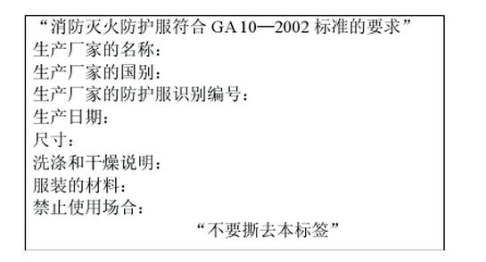 2、查看消防員滅火防護服是否有標簽,查看標簽內(nèi)容是否符合規(guī)定,每一件防護服應有永久性的標簽,標簽應放置在防護上衣前胸左側的舒適層上,標簽上應提供圖中所規(guī)定的內(nèi)容。