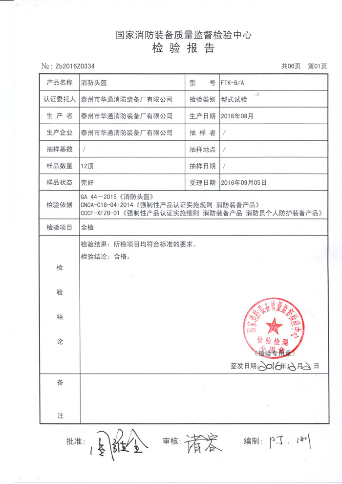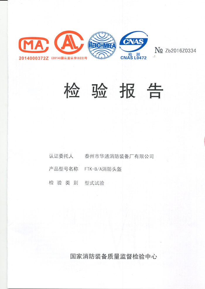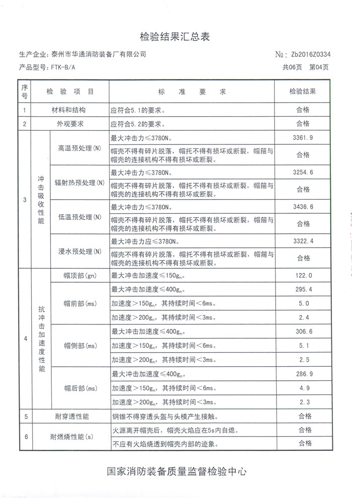 華通消防新型消防頭盔FTK-B/A符合GA44-2015標(biāo)準(zhǔn),CNCA-C18-04:2014《強(qiáng)制性產(chǎn)品認(rèn)證實(shí)施規(guī)則 消防裝備產(chǎn)品》,CCCF-XFZB-01《強(qiáng)制性產(chǎn)品認(rèn)證實(shí)施細(xì)則 消防裝備產(chǎn)品 消防員個(gè)人防護(hù)裝備產(chǎn)品》。沖擊吸收性能:最大沖擊力≤3780N,帽殼沒(méi)有碎片脫落,帽托亦沒(méi)有損壞和斷裂,帽箍于帽殼的連接機(jī)構(gòu)沒(méi)有損壞和斷裂??箾_擊加速度性能:帽頂部最大沖擊加速度≤150gn;帽前部最大沖擊加速度≤400gn;帽側(cè)部最大沖擊加速度≤400gn;帽后部最大沖擊加速度≤400gn。耐燃燒性能在火源離開(kāi)帽殼后,帽殼火焰在5s內(nèi)自熄,沒(méi)有火焰燒透到帽殼內(nèi)部跡象,帽殼沒(méi)觸及頭模,且無(wú)明顯變形,帽箍、帽托、緩沖層和下頦帶均無(wú)明顯變形和損壞,任何部件都無(wú)被引燃或融化。