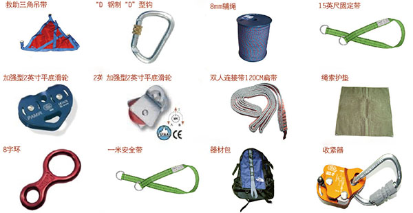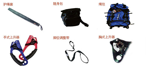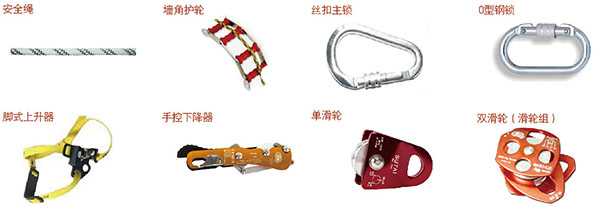 ·消防防墜落輔助設(shè)備星與安全嘶n安全吊帶、安全腰帶配套使用的承載部件的統(tǒng)稱,包括安全鉤、上升器、下降器、止鎖器、八字環(huán)、制動(dòng)桿、墻角護(hù)輪和滑輪裝置等。