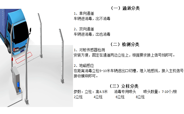 車輛消毒通道主要用途是為預(yù)防及防治流感、口蹄疫、霍亂、流行性疾病等病毒病菌的傳播,擴(kuò)散,需要在消防站、防疫站、省道、國(guó)道、高速公路、城鄉(xiāng)交接處、出入境檢疫站、無(wú)害化處理中心等處對(duì)貨物運(yùn)輸車輛、消防車輛及其它進(jìn)出通行的車輛進(jìn)行徹底的消毒,防止車輛外表面帶來(lái)的病原體擴(kuò)散傳播,達(dá)到進(jìn)出車輛防疫消毒目的。本消毒通道在消毒方式上采用高壓沖擊噴霧技術(shù),符合SN/T1333-2012《入出境汽車及其他車輛消毒規(guī)程》標(biāo)準(zhǔn)要求。